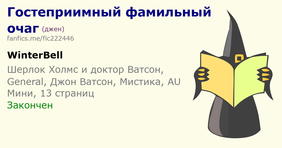<a href="https://fanficsnl.ru/fic222446"><b>Гостеприимный фамильный очаг</b></a> (джен)<br>Автор: <a href="https://fanficsnl.ru/user53424">WinterBell</a><br>Фандом: <a href="https://fanficsnl.ru/fandom10">Шерлок Холмс и доктор Ватсон</a><br>Персонажи: <a href="https://fanficsnl.ru/character428">Джон Ватсон</a>, <a href="https://fanficsnl.ru/character436">Шерлок Холмс</a>, <a href="https://fanficsnl.ru/character56641">Генри Баскервиль</a>, <a href="https://fanficsnl.ru/character56640">Хьюго Баскервиль</a>, <a href="https://fanficsnl.ru/character38">Новый Мужской Персонаж</a><br>Рейтинг: General<br>Жанр: Мистика, AU<br>Размер: Мини | 45 537 знаков<br>Статус: Закончен<br>Предупреждения: Смерть персонажа<br>Саммари:<br>В раскрытие зловещей тайны, нависшей над Баскервилями, вмешивается упоминаемая в каноне творческая личность. Три поросенка-AU
